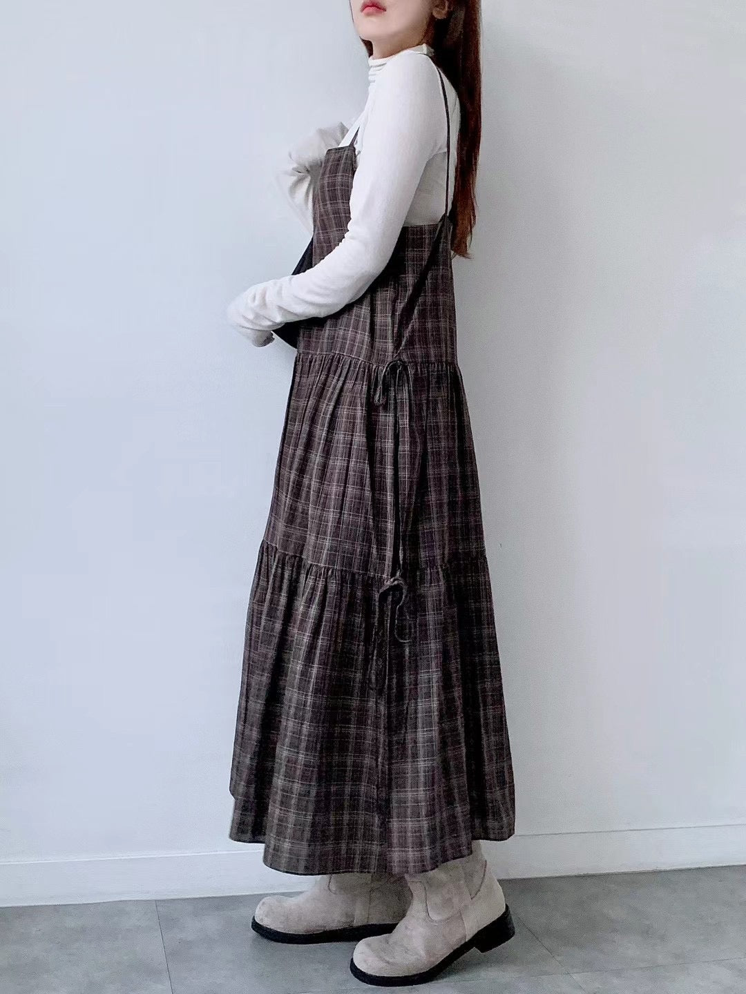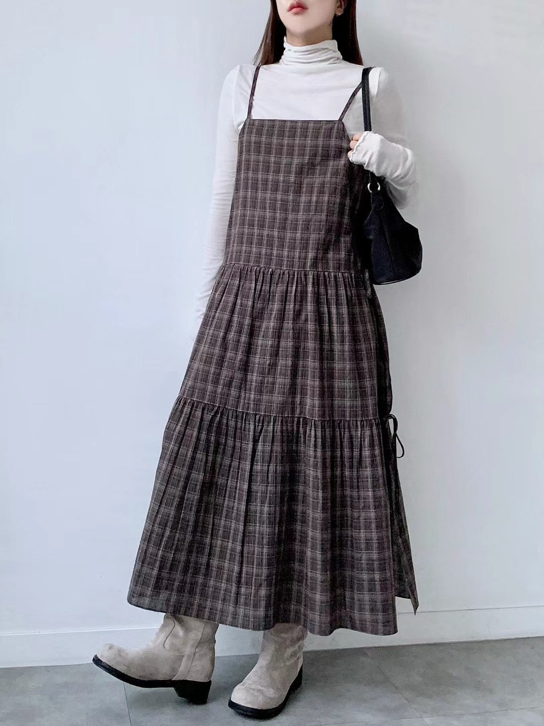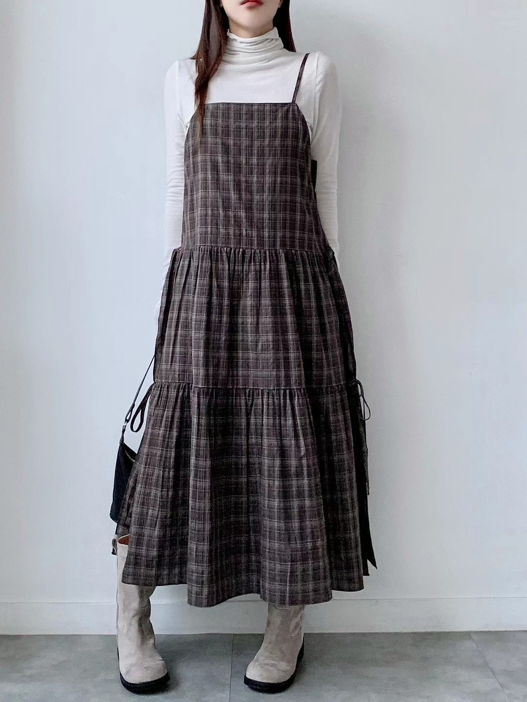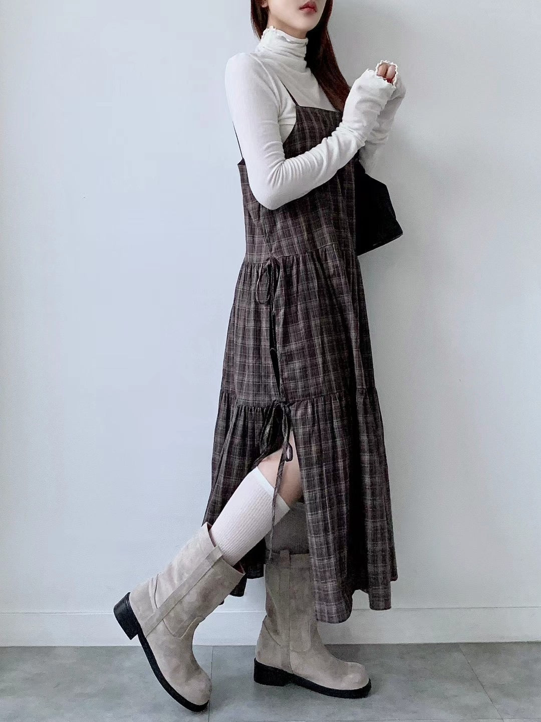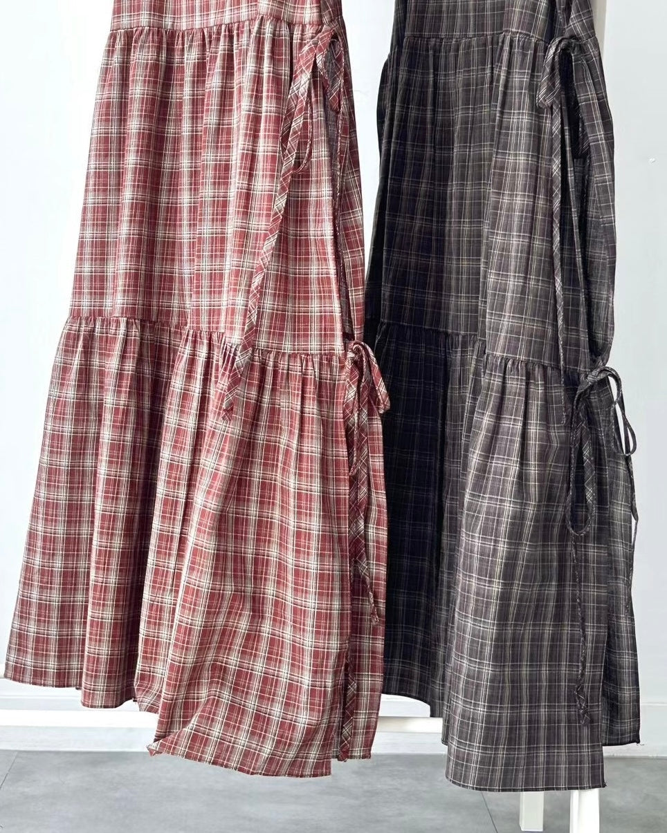 韓國丨吊帶格紋綁帶裙