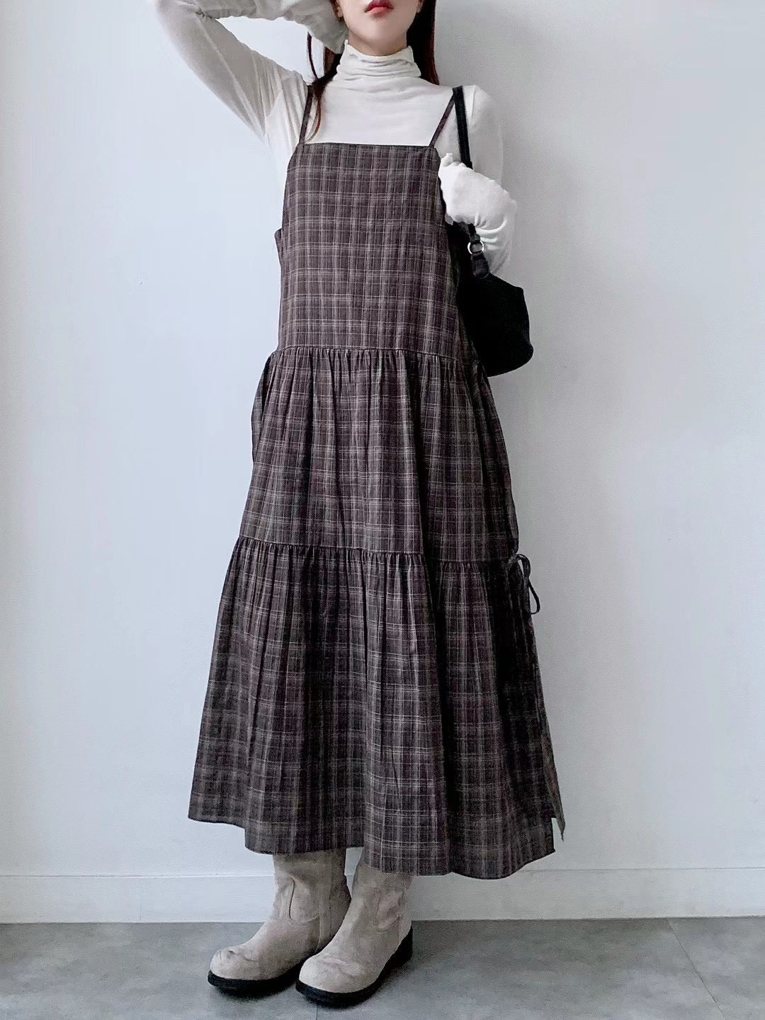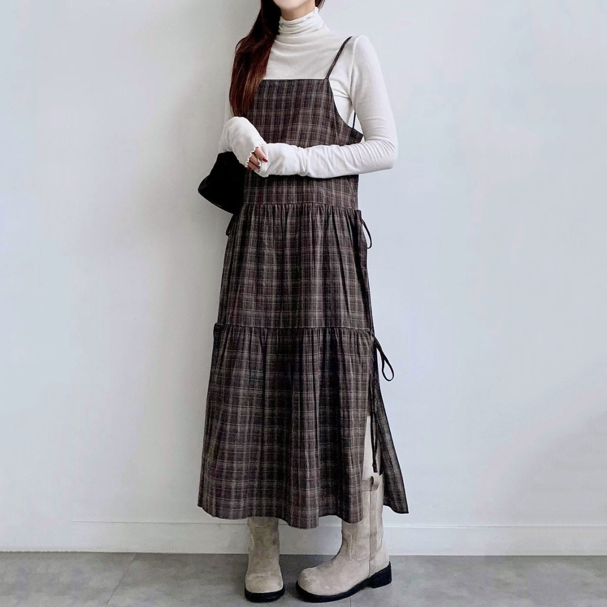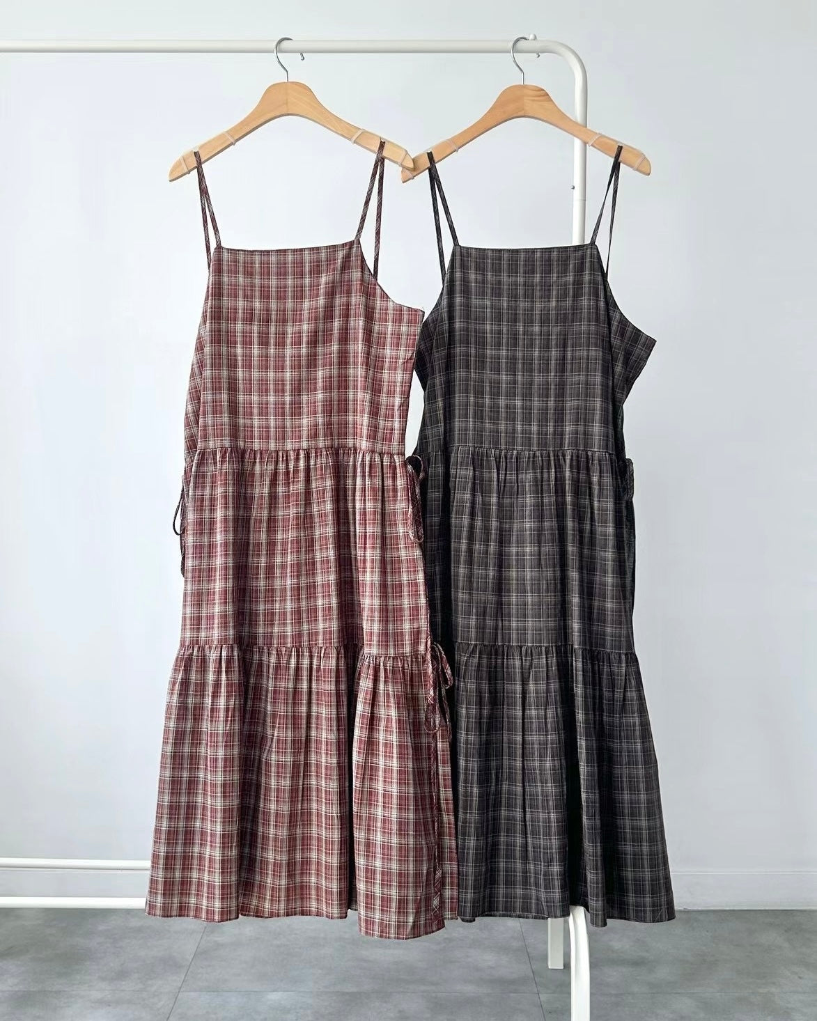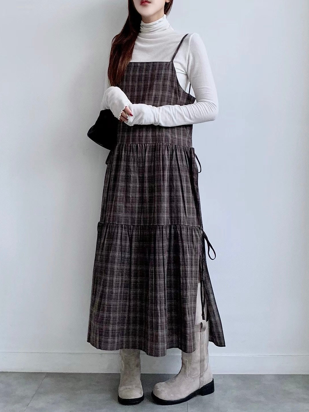 韓國丨吊帶格紋綁帶裙